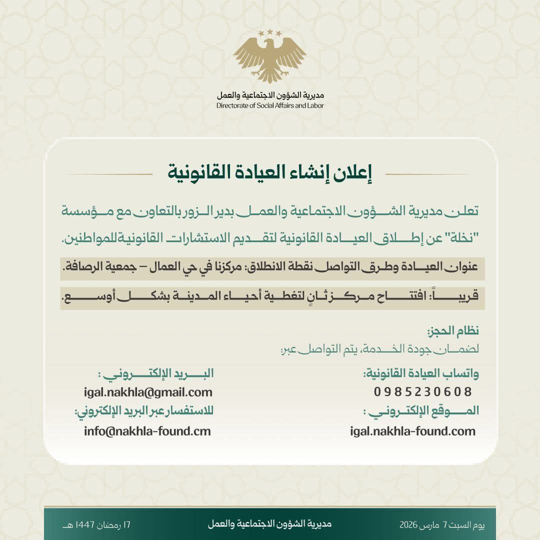 The Directorate of Social Affairs and Labor in Deir Ezzor Governorate, in cooperation with “Nakhla” institution, announced the launch of the “Legal Clinic” initiative to provide free legal consultations to citizens and enhance awareness of legal rights and duties.